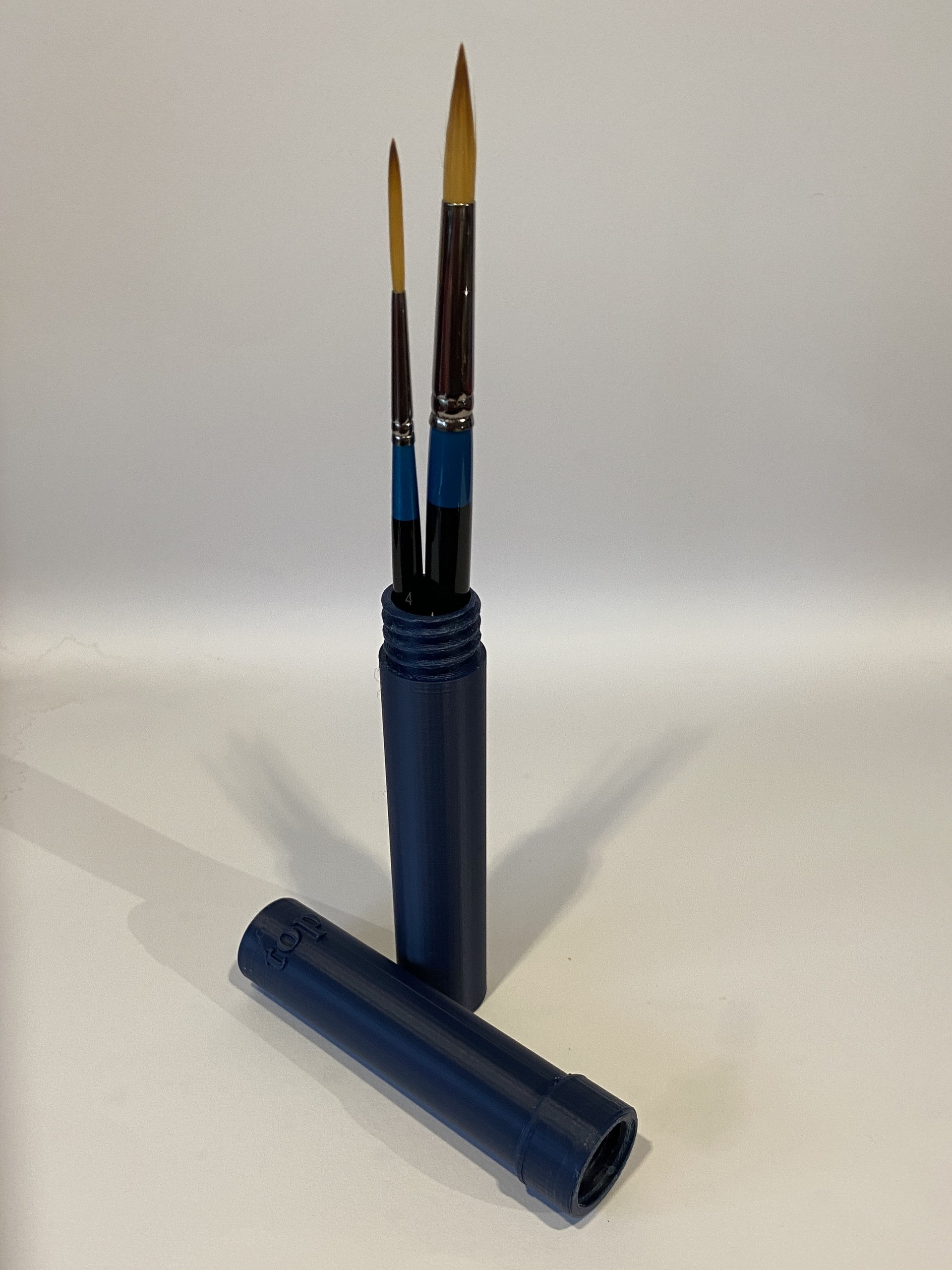 Two halves screw neatly together. One is marked “top” to remind you which way up your brushes are!