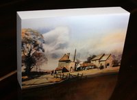Freestanding wooden block printed with a painting of a typical Kent view.