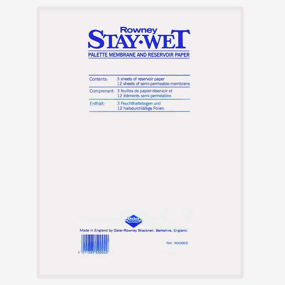 A set of refills for the Large Daler-Rowney Stay-Wet Palette. Contains 3 sheets of reservoir paper and 12 sheets of membrane paper.