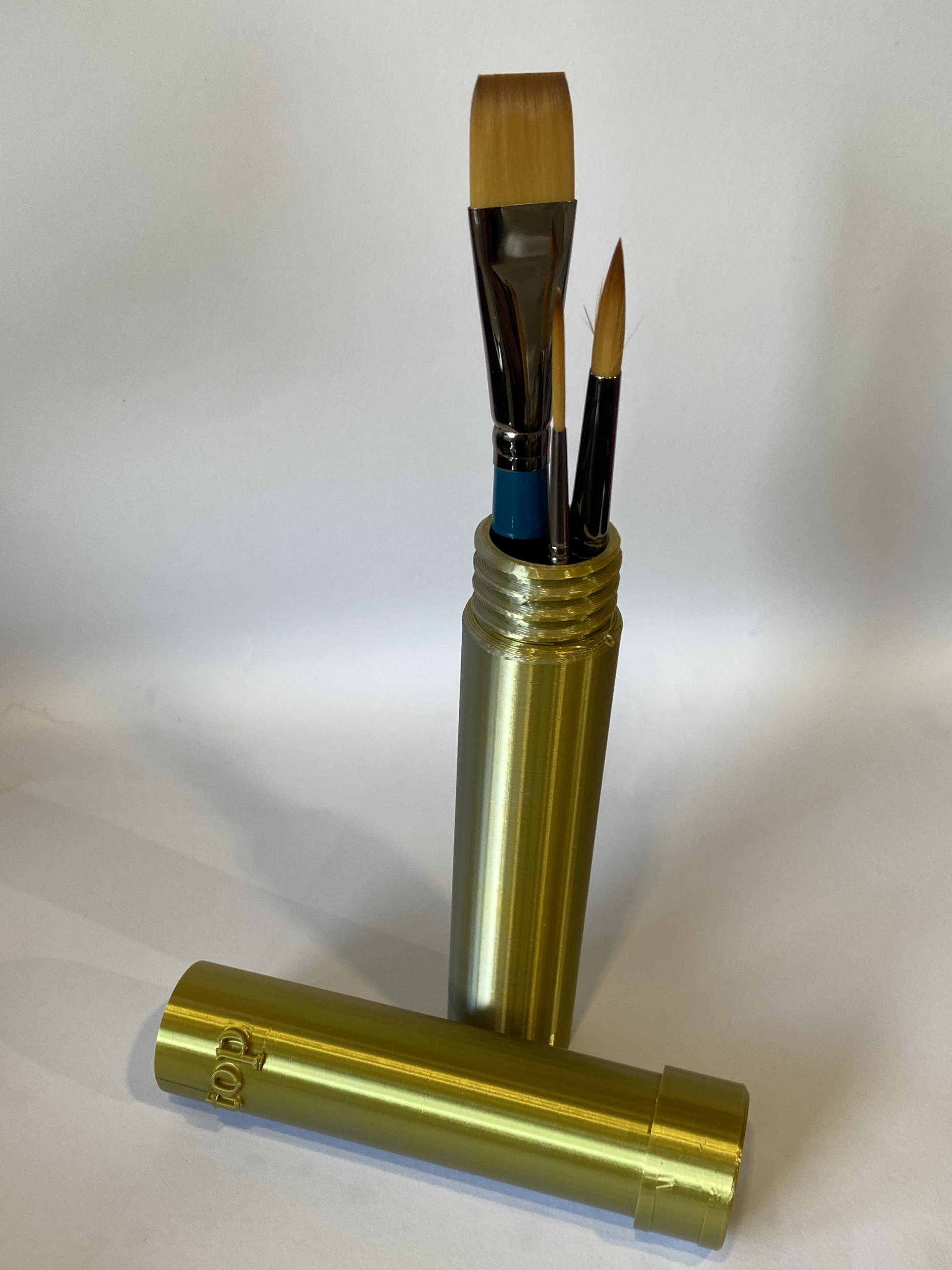 Two halves screw neatly together. One is marked “top” to remind you which way up your brushes are! Length is 9 inches (21cm). Will hold…