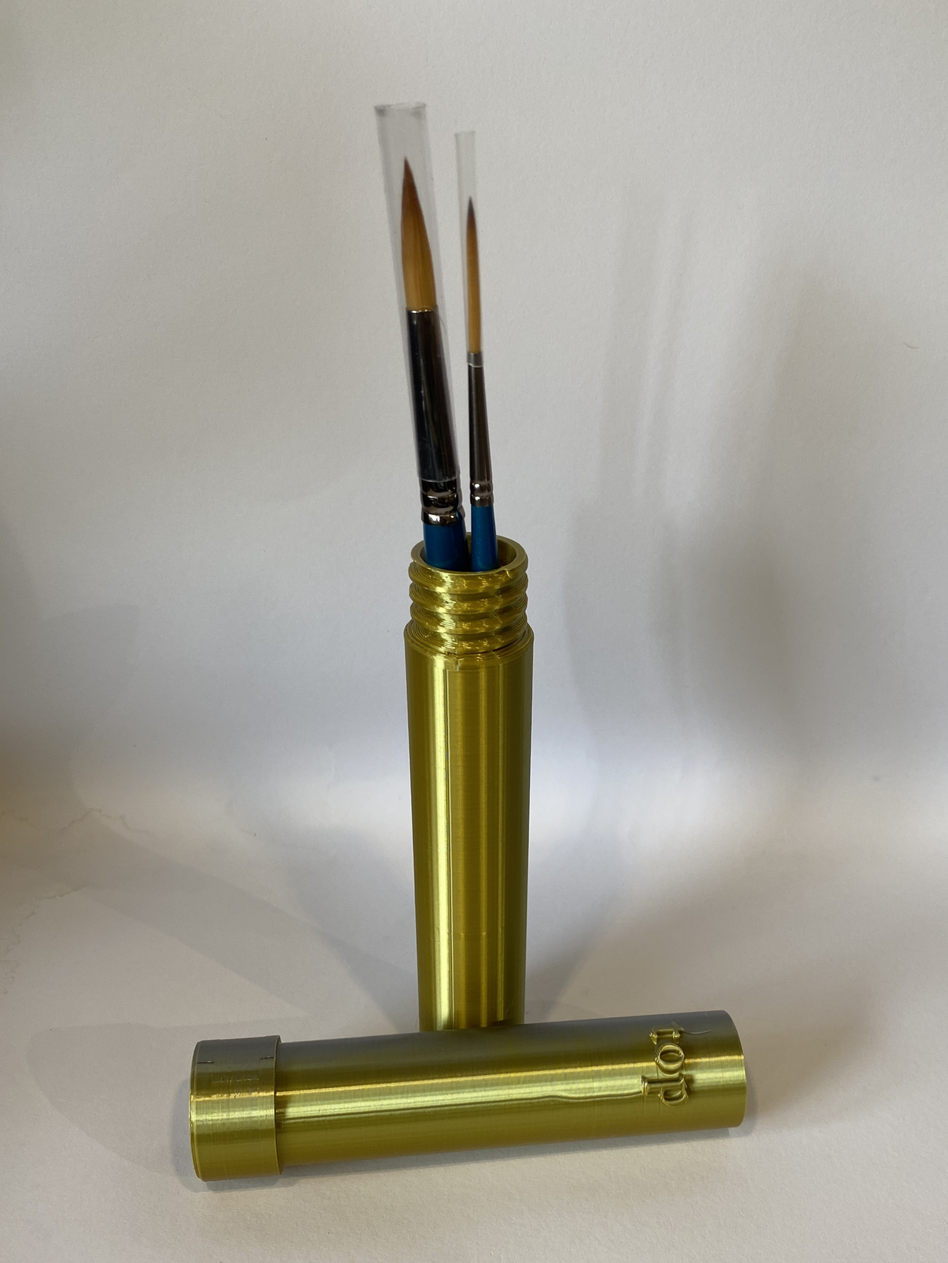 Two halves screw neatly together. One is marked “top” to remind you which way up your brushes are!