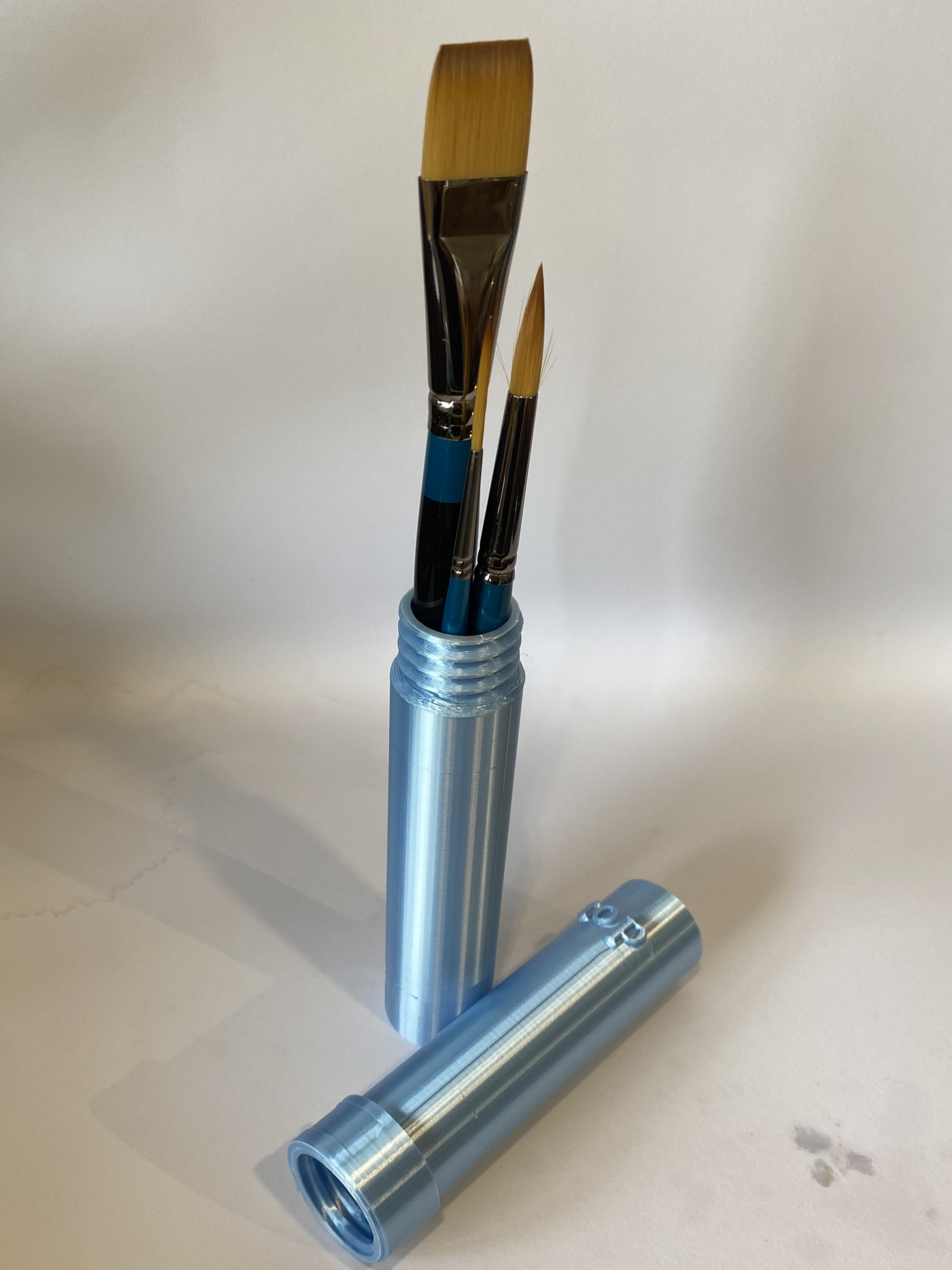 Two halves screw neatly together. One is marked “top” to remind you which way up your brushes are!