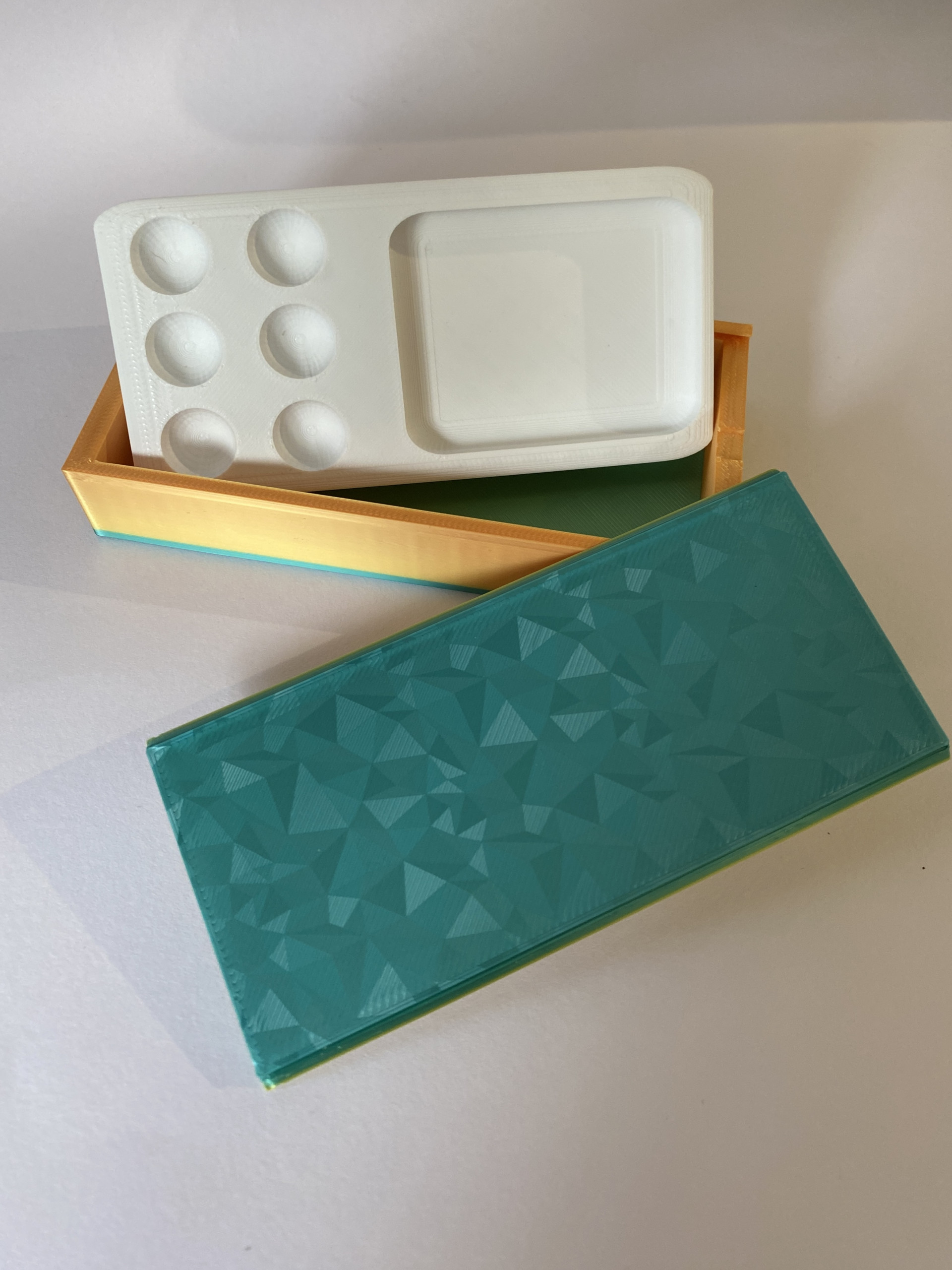 The inner palette fits snugly but can be removed for cleaning, unless you wish to cultivate a palette like Charlie’s! The top slides across for a secure fit.