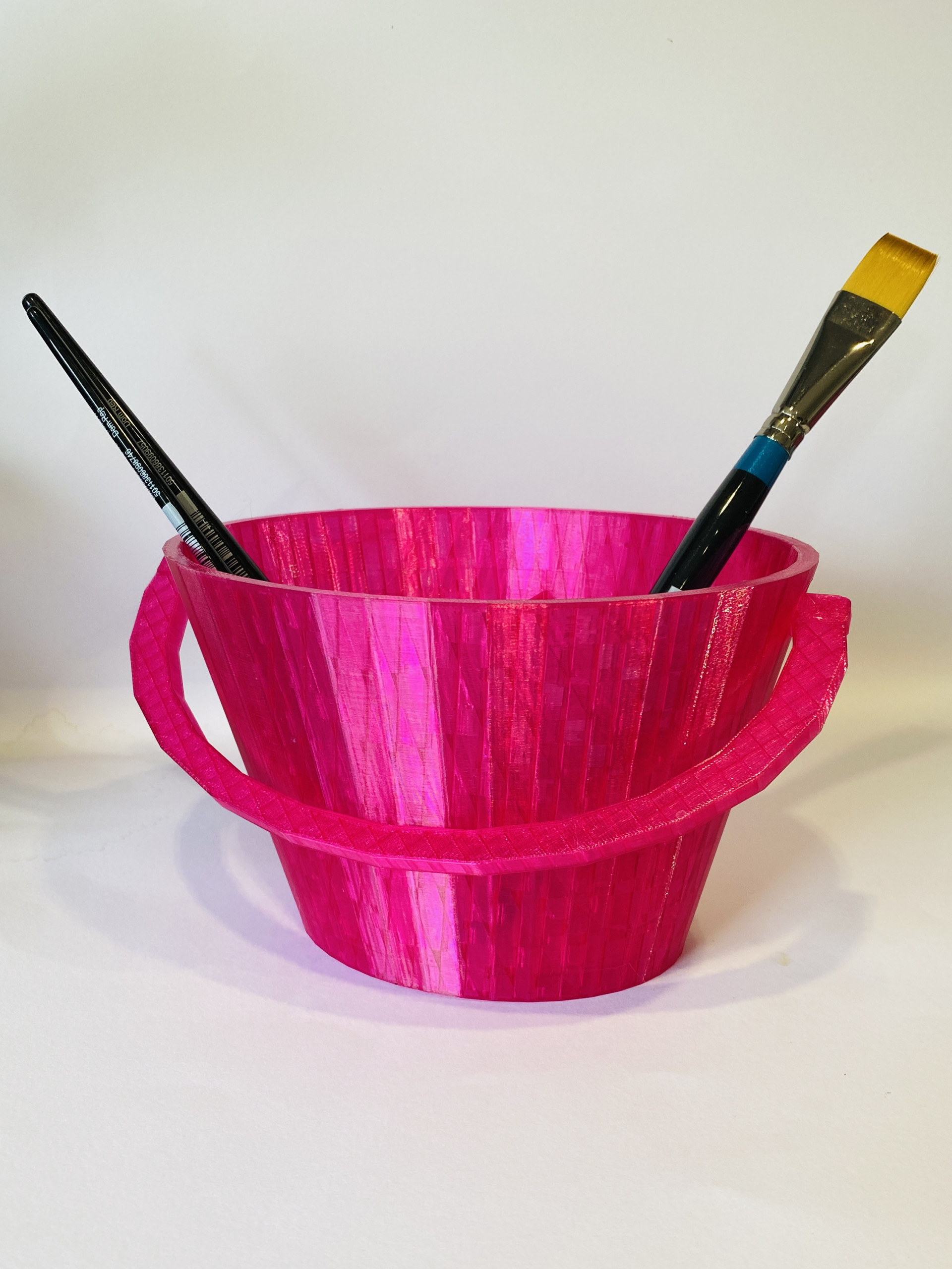 Just a plain bucket but rather pretty. The buckets are 5 inches high and 5 inches across the top and very light but stable and…
