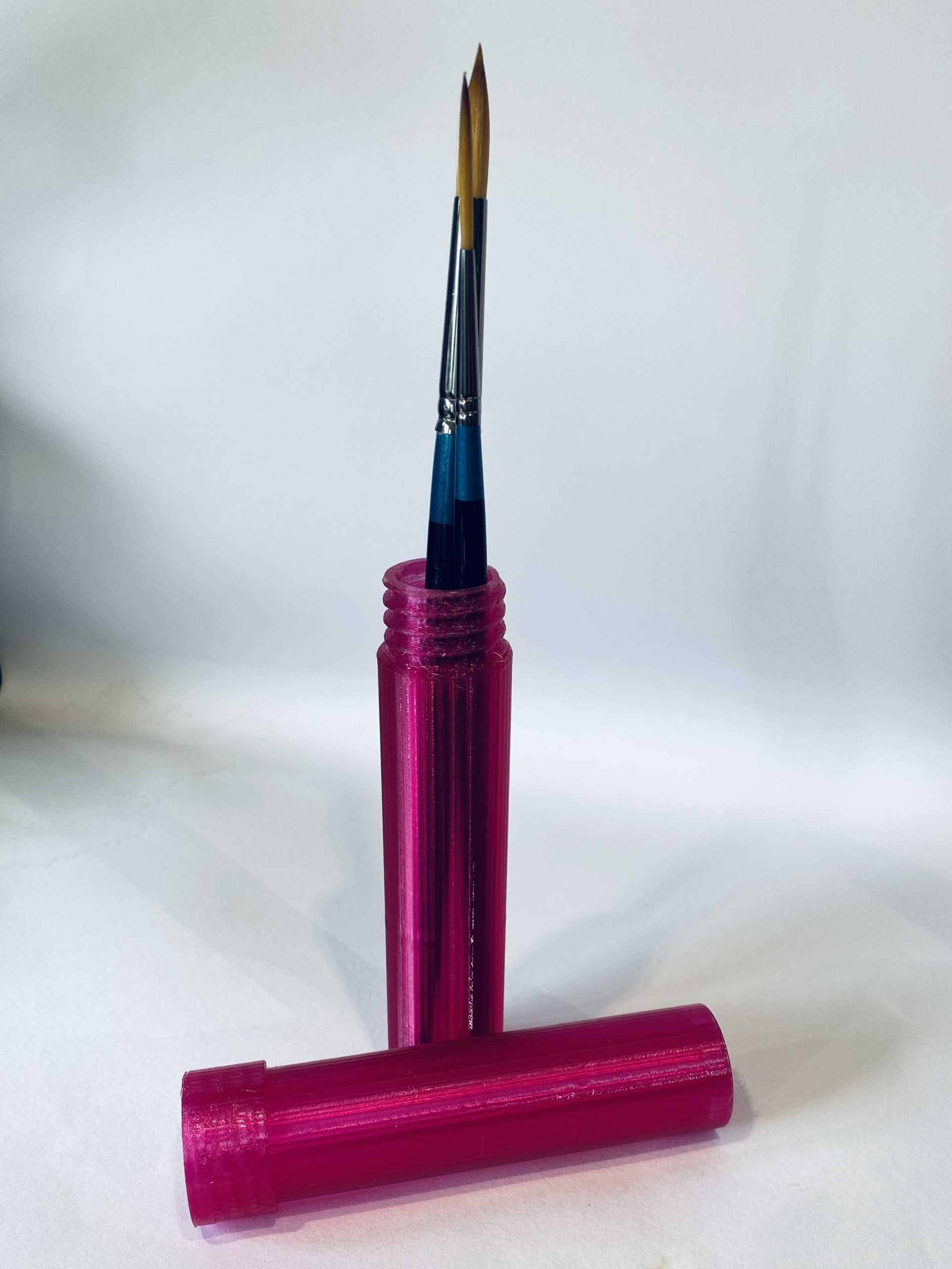 Two halves screw neatly together. One is marked “top” to remind you which way up your brushes are! Length is 9 inches (21cm). Will hold…
